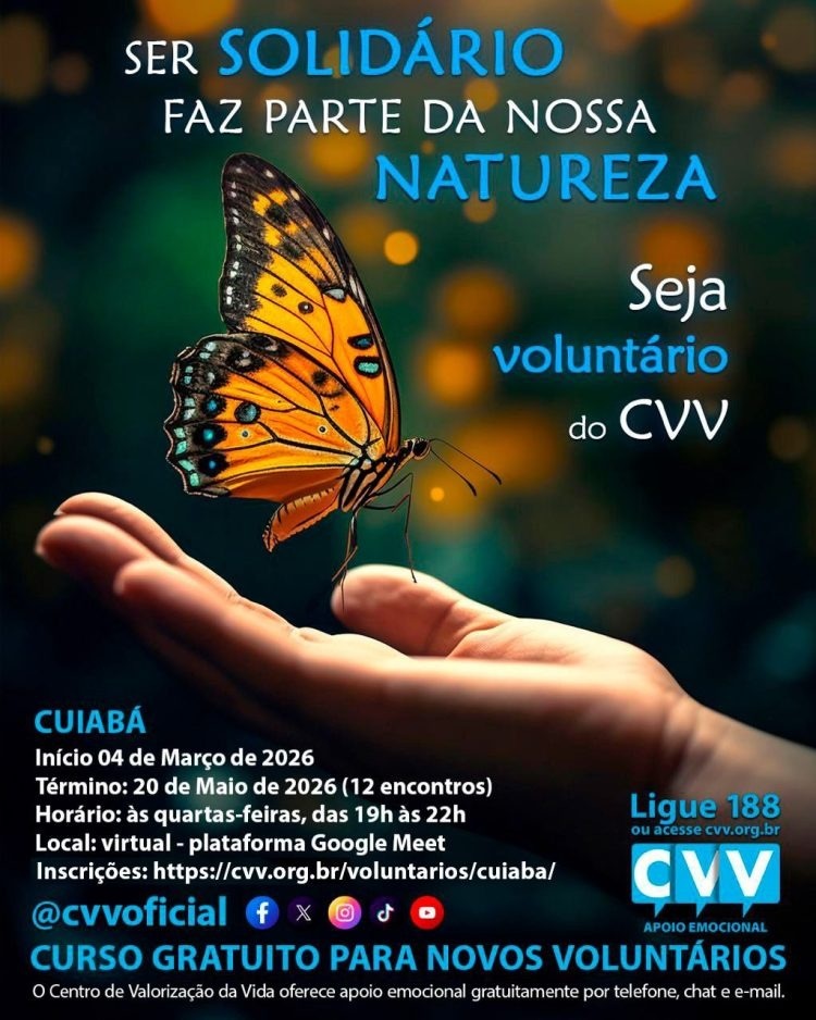 O CVV, Centro de Valorização da Vida, abriu inscrições para um novo curso gratuito de capacitação e seleção de voluntários em Cuiabá.