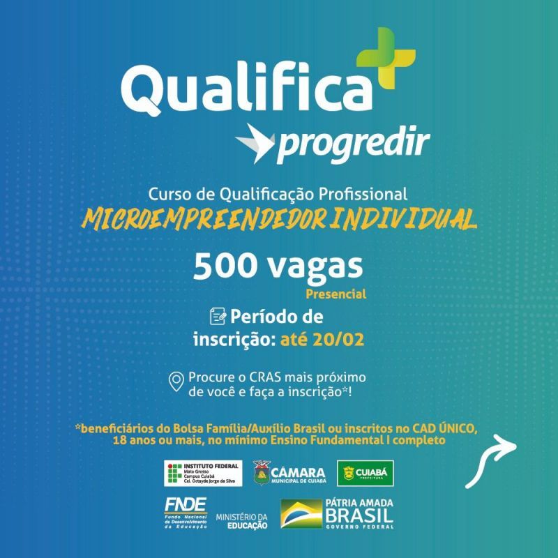 As inscrições para o curso ‘Qualifica mais Progredir”, em Cuiabá, podem ser feitas até o próximo domingo, 20 de fevereiro.