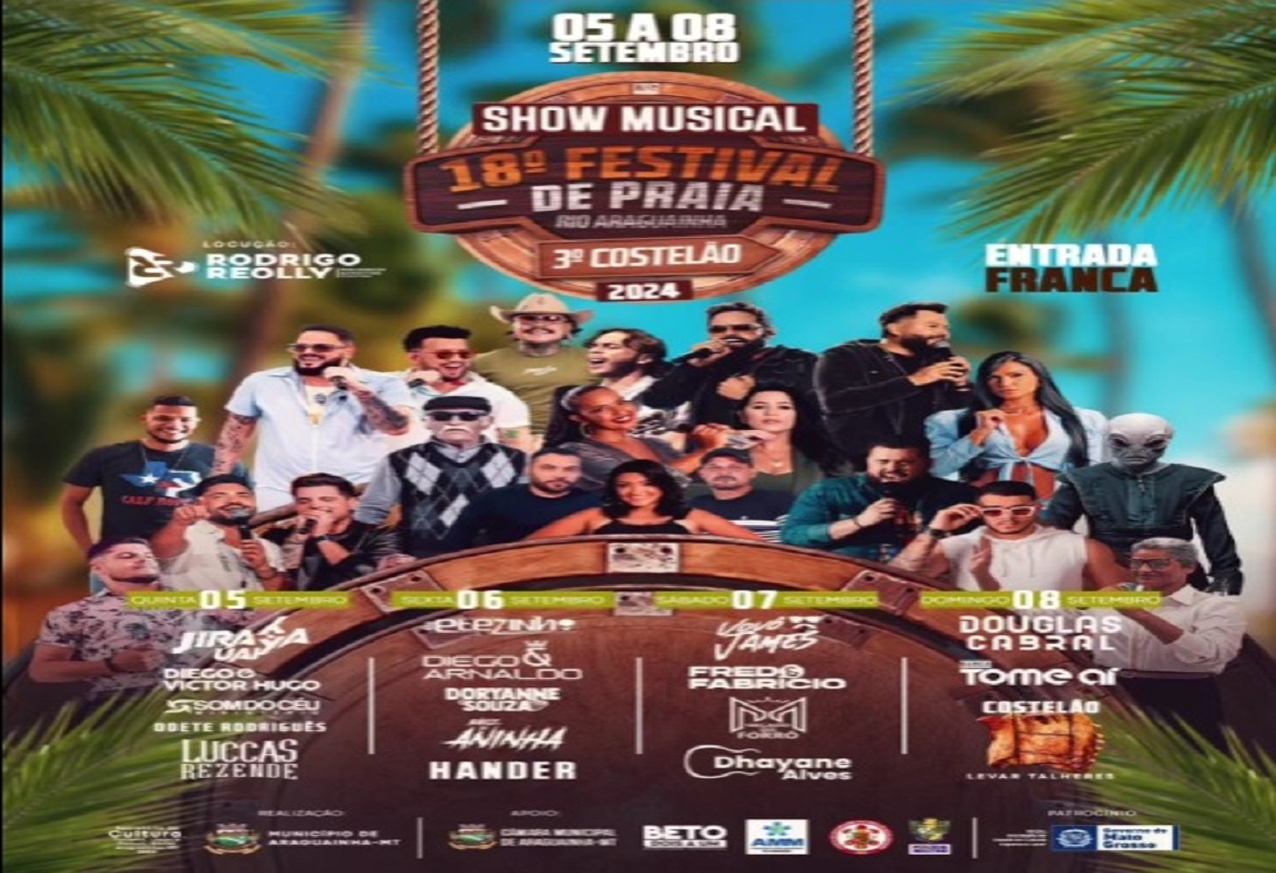Entre os dias cinco e oito de setembro, acontece o 18° Festival de Praia do Rio Araguainha e 3° Costelão.