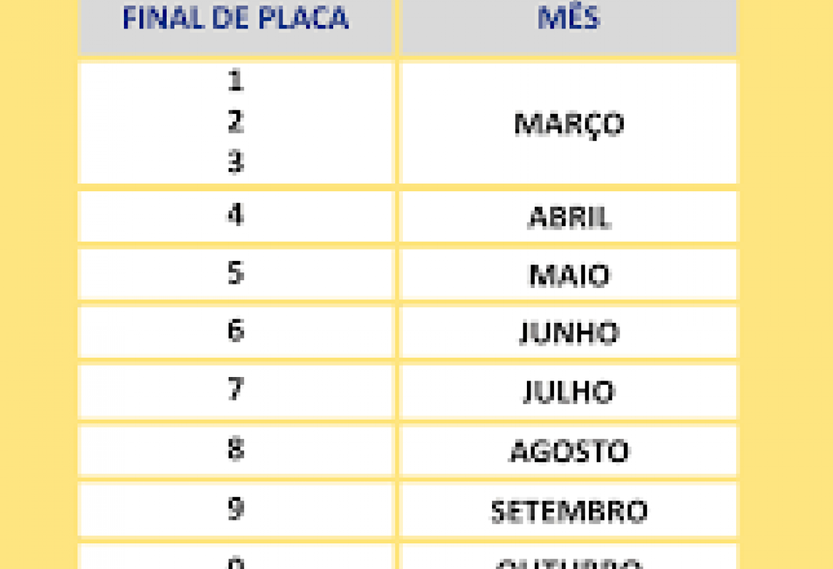 Placa final 4, será em abril; final 5 em maio; final 6 em junho; placa final 7 será em julho; final 8 em agosto; 9 em setembro e placa final 0 em outubro.