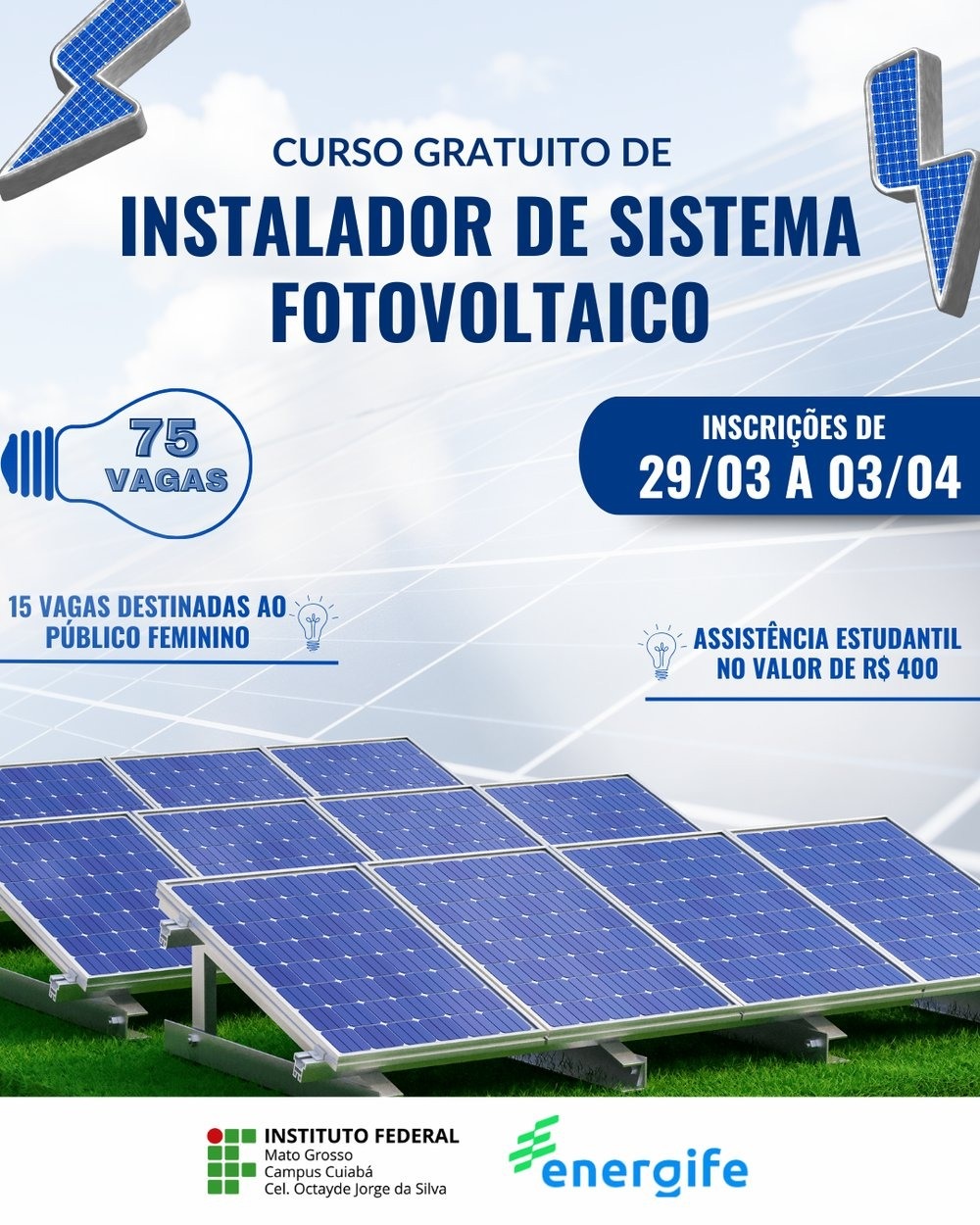 O IFMT Campus Cuiabá - Coronel Octayde Jorge da Silva, lançou um edital com 75 vagas para o curso de Formação Inicial e Continuada de Eletricista de Energias Renováveis - Instalador de Sistema Fotovoltaico.