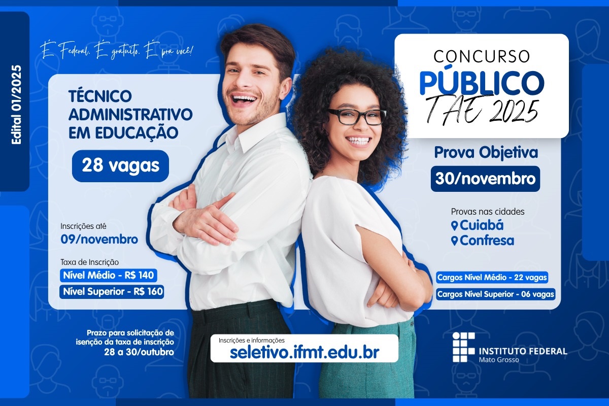 O IFMT, Instituto Federal de Educação, Ciência e Tecnologia de Mato Grosso, publicou edital de concurso público para o preenchimento de 28 vagas efetivas na carreira de Técnico-Administrativo em Educação.