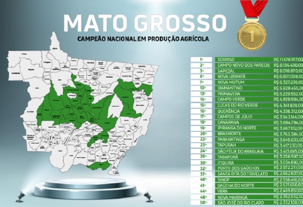Entre os 10 municípios brasileiros com os maiores valores de produção agrícola no ano passado, seis são de Mato Grosso.