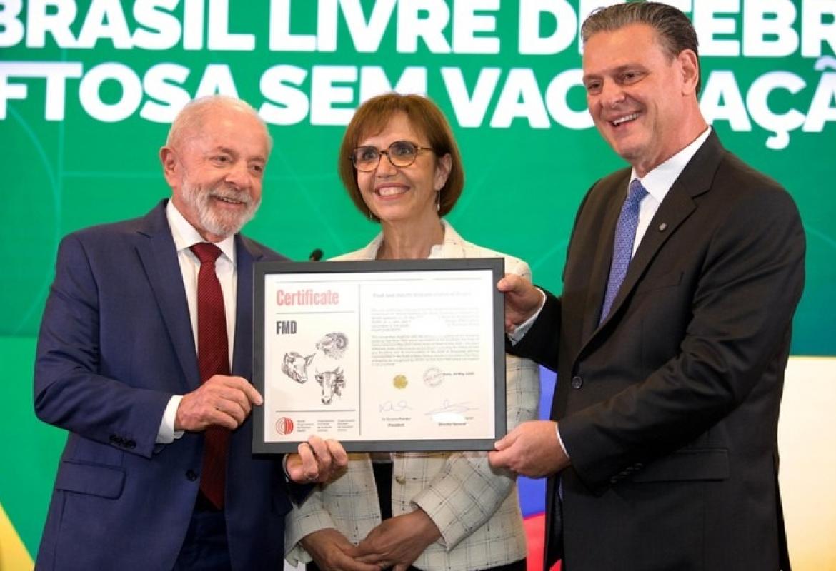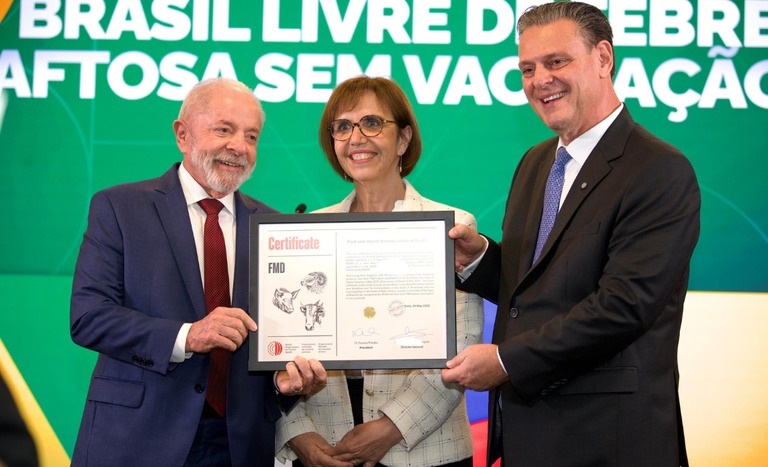 Na última sexta-feira, em Paris, na França, o presidente Luiz Inácio Lula da Silva, e o ministro da Agricultura e Pecuária, Carlos Fávaro, receberam das mãos da diretora-geral da Organização Mundial da Saúde Animal, Emmanuelle Soubeyran, o certificado reconhecendo o Brasil como país livre de febre aftosa sem vacinação.