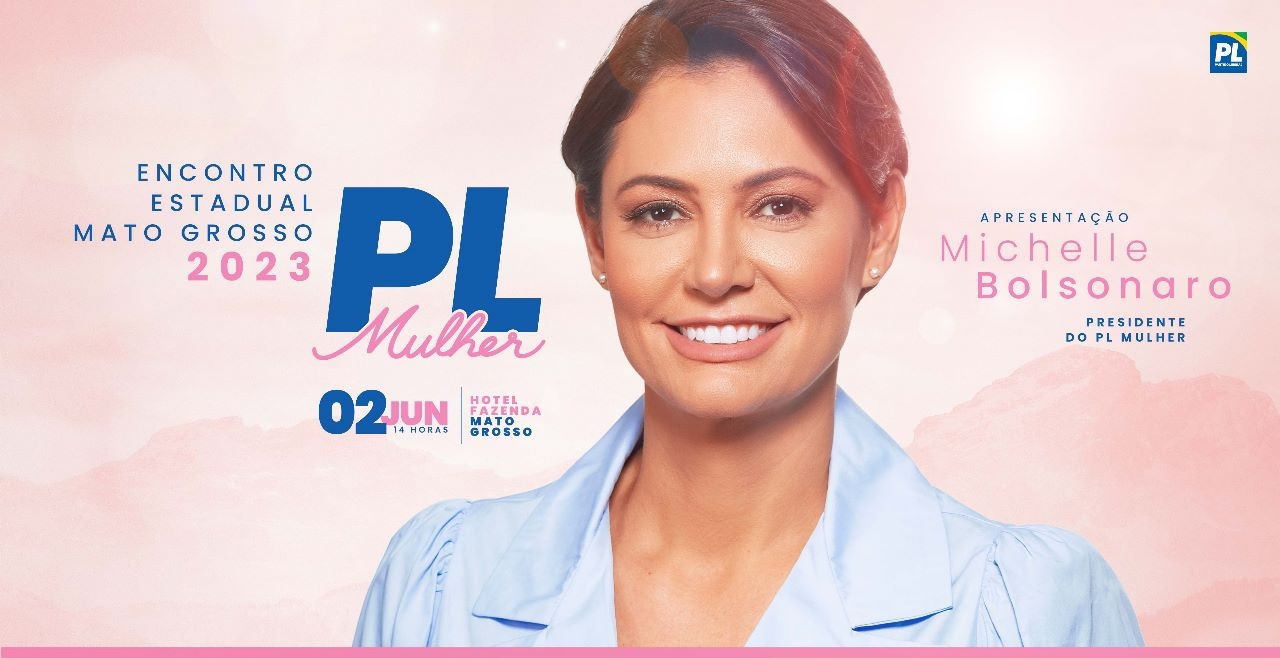 Encontro Estadual do PL Mulher com a presença de Michele Bolsonaro será realizado no Hotel Fazenda Mato Grosso, a partir das duas horas da tarde, no dia dois de junho.