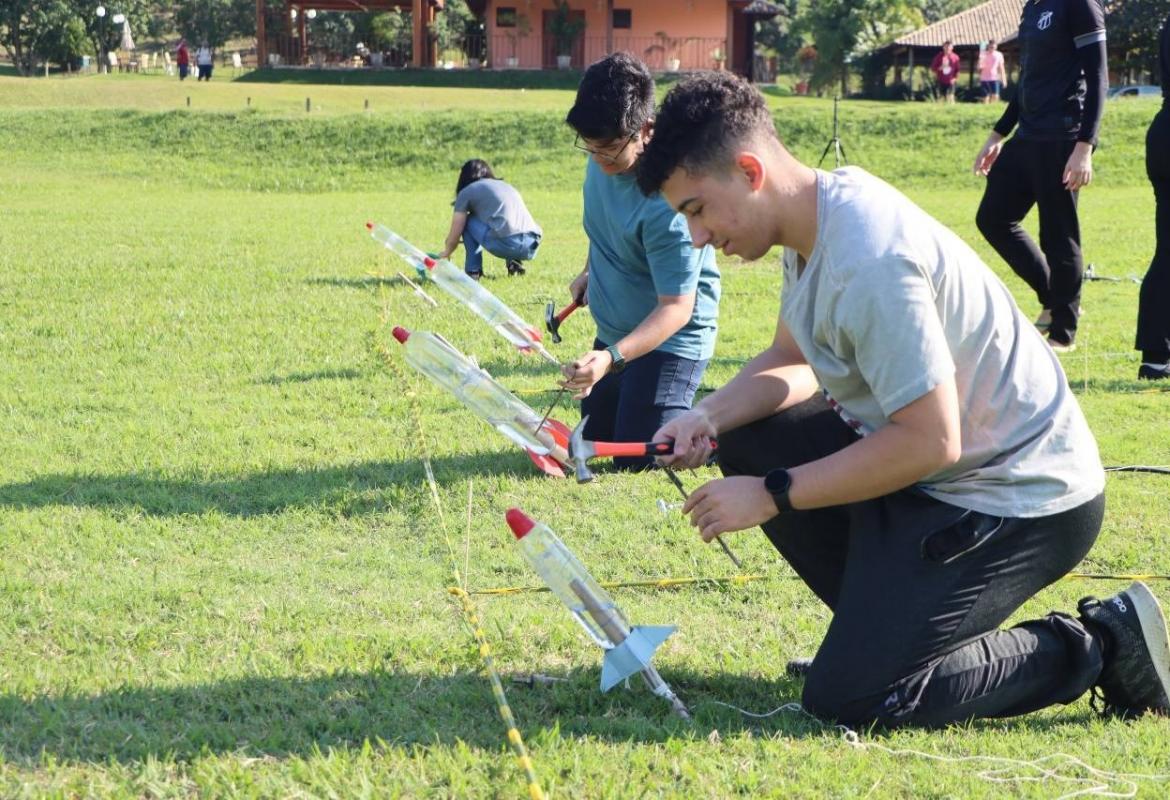 A proposta é elaborar e lançar foguetes feitos de papel, canudinho, garrafa pet ou de tubo de PVC.