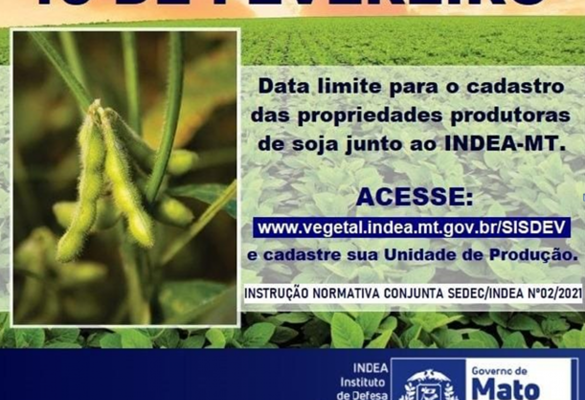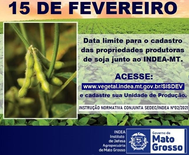 Os produtores de soja de Mato Grosso têm até esta terça-feira, 15 de fevereiro, para cadastrar as Unidades de Produção de soja da safra 2021/2022 junto ao Indea, Instituto de Defesa Agropecuária.