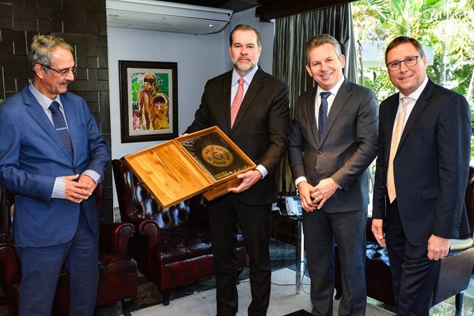 Em seguida, o ministro Dias Toffoli, foi recepcionado, no Palácio Paiaguás, pelo governador Mauro Mendes, ocasião em que foi homenageado com a comenda Ordem do Mérito Mato Grosso.