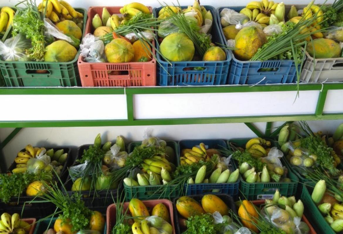 São produtos fresquinhos e saborosos, diretamente do campo, como: alface, couve, tomate, mandioca, abóbora, pepino, cheiro verde, pimenta de cheiro, pimentão, quiabo, melão, mamão, banana, limão e batata doce.