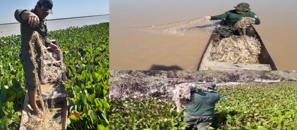 Policiais militares do Batalhão Ambiental e agentes da Sema, Secretaria de Estado de Meio Ambiente, apreenderam nesta quarta-feira, uma rede de pesca predatória de mil e 200 metros, em Santo Antônio do Leverger.